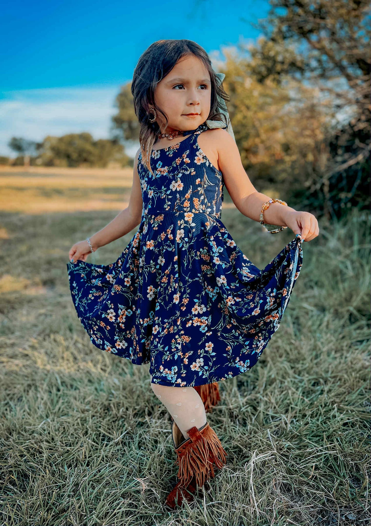 Brielle is the perfect summer dress for all occasions! With a scooped back and your pick of shoulder ties or halter ties, this knee length twirl dress is sure to delight all ages.